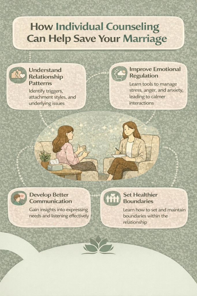 Individual therapy focuses on understanding your emotional responses, communication habits, and relational triggers.