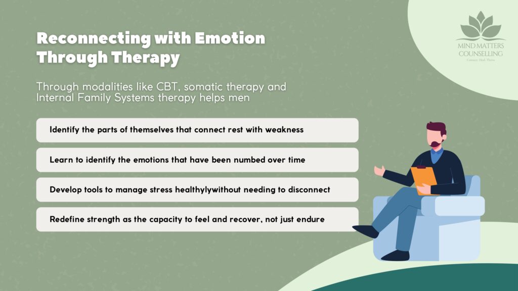 Through modalities like CBT, somatic therapy, and Internal Family Systems, therapy helps men: